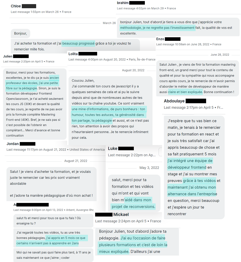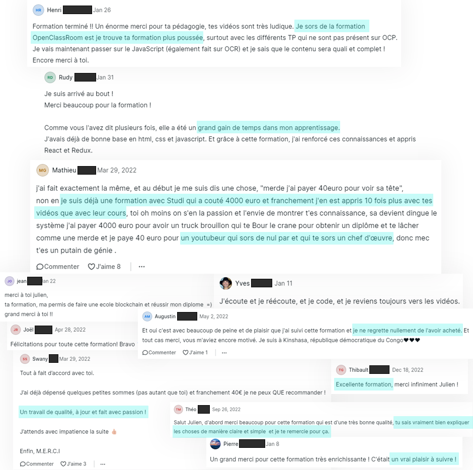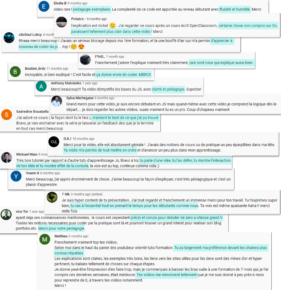 Dès lors j’ai créé ma chaine Youtube pour expliquer ce que j’apprenais, une sorte de prétexte pour coder beaucoup de choses par moi-même. Par la suite, en parallèle de mes premières missions Freelance, j’ai eu l’occasion d’enseigner le code en présentiel à plusieurs centaines d’élèves. Suite à ces expériences je me suis dit qu’il serait temps que je condense tout mon savoir, ma méthode, mais aussi toutes mes expériences d’enseignements dans des formations. Des formations que j’aurais rêvé d’avoir quand j’ai débuté.